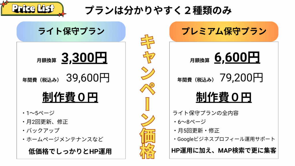 | 保守管理料(ライト保守プラン) | ホームページ更新・投稿代行など サーバー・ドメイン管理(費用弊社負担) | 39,600円/年 (月額換算:約3,300円) |